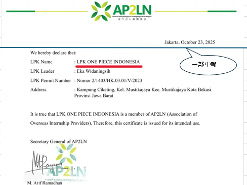 インドネシア共和国公認 送出し機関番号 2/1403/HK.03.01/IV/2023