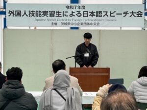 12/14(日)、茨城県水戸市で開催された技能実習生による日本語スピーチ大会で、タイから来た技能実習生コーンさんが、「将来の夢」を語り、見事に優秀賞を受賞しました。コーンさんは9月に入国したばかり、まだ滞在4か月と日も浅く、スピーチした他の技能実習生は1年以上の方が多かったので大金星ですね!賞品はうれしい「お米」でした!これからも頑張って下さい!